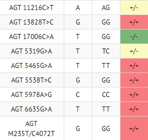 As you can see AGT gene mutations can cause many symptoms and also lead to many diseases.  Here is what they may look like, homozygous (double bad copies in red), heterozygous (1 half a bad copy in yellow):
