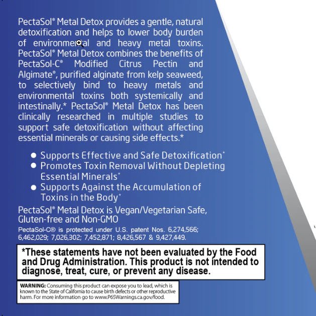 PectaSol® Metal Detox provides clinically proven, natural detoxification to help lower body burden of heavy metals and environmental toxins such as radioactive particles. PectaSol® Metal Detox combines the detoxification properties of PectaSol-C® Modified Citrus Pectin and Algimate®, modified alginates purified from kelp seaweed, to bind to heavy metals in the digestive and circulation systems without disrupting essential mineral balance, for safe elimination.*